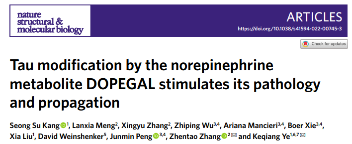 北京时间2022年3月25日,Nature Structural & Molecular Biology 杂志在线发表了深圳理工大学(暂定名,以下简称“深理工”)叶克强团队和武汉大学人民医院张振涛团队的最新成果。研究团队发现脑内蓝斑部位的去甲肾上腺素代谢产物DOPEGAL共价修饰Tau蛋白的K353位点,促进Tau的聚集和病变的播散。本研究为探索阿尔茨海默病(Alzheimer’s disease, AD)的发病机制给予了新的视角。
