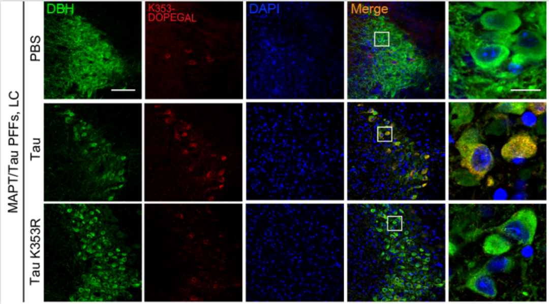 图2:阻断DOPEGAL对Tau的修饰可以延缓Tau的聚集,向过表达Tau的转基因小鼠脑内注射Tau聚集体可以诱导脑内的Tau聚集,而突变K3533位点后阻断了DOPEGAL对Tau的修饰,脑内Tau的聚集减少