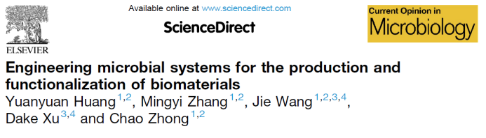 Yuanyuan Huang, Mingyi Zhang, Jie Wang, Dake Xu and Chao Zhong. Engineering microbial systems for the production and functionalization of biomaterials. Curr. Opin. Microbiol, 2022.