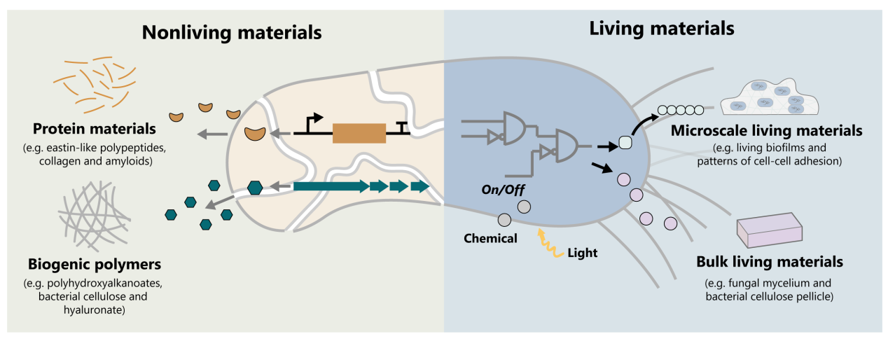 工程微生物系统生产各种可定制和可持续的生物材料,是当前合成生物材料的新趋势。此外,利用微生物系统生产的“活”材料具有可再生、自修复、环境响应等特性,并已经将生物材料的应用范畴从药物递送、伤口愈合领域拓展至生物电子以及活体治疗等领域。