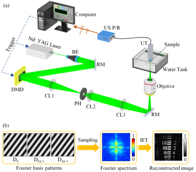 光声显微成像具备高分辨、三维无标记成像等优势,被广泛用于活体生物组织结构和功能成像。传统光声显微成像技术主要依靠逐点扫描进行三维图像采集,受限于步进电机、光学振镜等扫描器件的扫描速度局限,传统光声显微技术的成像速度远低于视频帧率(30 Hz),难以满足生物体快速生理活动监测的需求。针对该问题,研究团队提出了一种基于单像素成像技术的高速非扫描光声显微成像(SPN-PAM)。该技术利用高速数字微镜(DMD)实现成像区域的结构光场照明,顺利获得快速调制结构光场傅里叶照明条纹,获取图像的变换域频谱信息,采用傅里叶频谱逆变换即可完成图像快速重建。