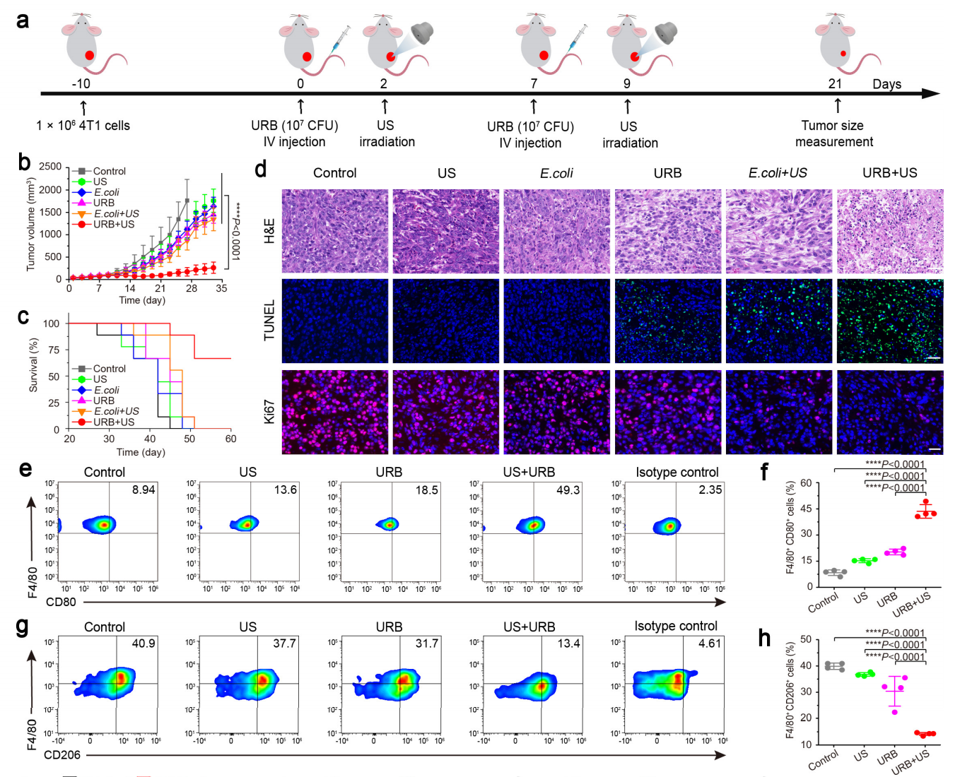接着研究团队利用该方法应用到乳腺癌荷瘤小鼠的免疫治疗,顺利获得尾静脉注射工程化菌,待工程化细菌迁移到肿瘤区域后,采用超声辐照诱导细菌表达IFN-γ,随后监测肿瘤生长情况与小鼠生存时间,结果显示超声诱导工程化细菌表达IFN-γ能显著抑制小鼠乳腺癌的生长,并延长荷瘤小鼠的生存时间。同时发现肿瘤中的M1型肿瘤相关巨噬细胞占比明显升高,而M2型肿瘤相关巨噬细胞占比降低,说明顺利获得超声诱导肿瘤内细菌表达IFN-γ显著激活肿瘤微环境中的巨噬细胞,改善免疫微环境。