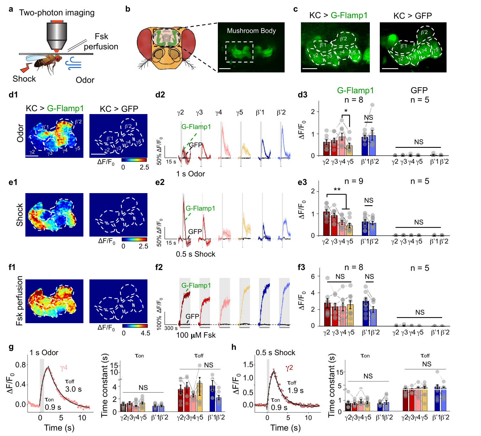 随后,研究人员将G-Flamp1探针应用在果蝇这一模式生物中。果蝇脑部蘑菇体(mushroom body)Kenyon细胞中cAMP信号通路在气味相关的记忆中发挥关键作用。作者第一时间获取了Kenyon细胞中表达G-Flamp1探针的转基因果蝇,然后利用双光子成像发现,果蝇受到气味或电击刺激时,蘑菇体不同子区域呈现不一样的cAMP信号时空变化(2),暗示不同子区域可能在联想性学习中起着相对独立的作用。