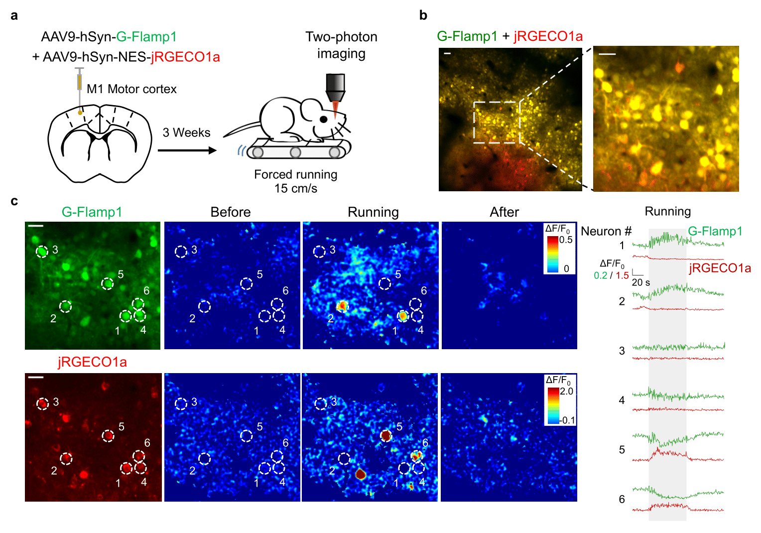 为验证G-Flamp1探针在活体动物中检测cAMP 动态变化的实用性,研究人员利用腺相关病毒在小鼠运动皮层中共表达绿色G-Flamp1探针和红色jRGECO1a钙探针。活体双光子成像揭示了跑步运动细胞特异性的cAMP信号,并与钙信号无明显相关性(3)。这反映了小鼠运动时大脑皮层M1神经元反应的异质性。