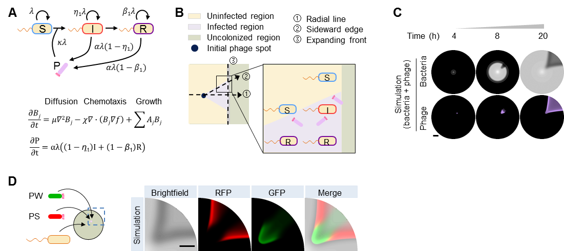 A,细菌SIR三种状态的转化及噬菌体生产的数学描述;B,感染动态在不同位置和方向上的差异性;C,模型模拟噬菌体感染区的形成动态;D,模型模拟强弱噬菌体初始比例为PS:PW=1:105 的空间竞争