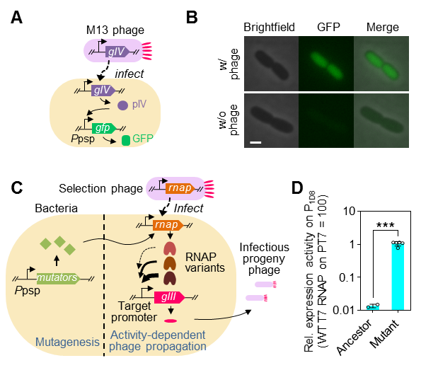 A, 利用噬菌体休克蛋白(phage shock protein, psp)启动子改造诱变模块;B, psp启动子仅在存在噬菌体感染的条件下启动表达;C,SPACE系统基因线路设计;D,T7 RNA聚合酶进化前后识别目标启动子的活性变化