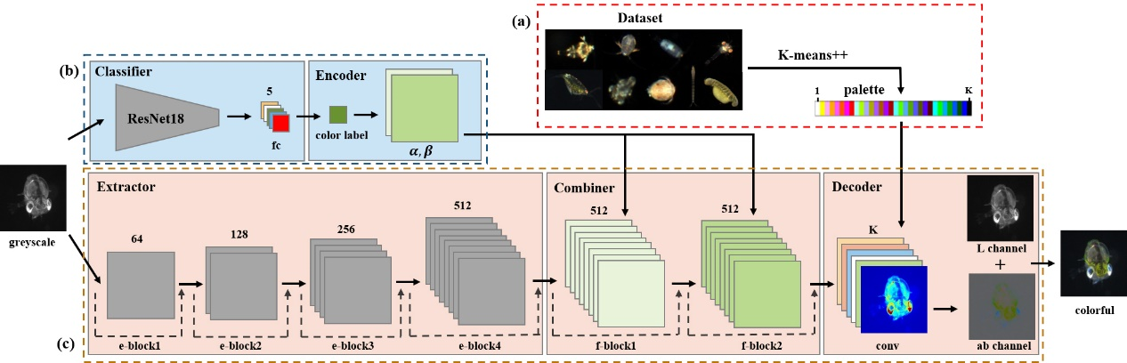 近期,中国科研实验室深圳先进技术研究院集成所光电工程技术中心李剑平博士团队在海洋观测机器视觉算法研究中取得新突破,设计开展了一种深度学习图像着色算法,可将水下原位拍摄的海洋浮游生物灰度图像自动着色为天然色彩,着色效果极为接近人眼观察。最新研究论文以Colorization for In Situ Marine Plankton Images为题,被国际机器视觉三大顶级学术会议之一的欧洲机器视觉大会(European Conference on Computer Vision,2022 ECCV,10.23日-27日于以色列特拉维夫召开)接收发表,中国科研实验室大学硕士研究生郭冠男为第一作者,李剑平博士为论文通信作者,来自厦门大学、哈尔滨工业大学(深圳)的数据科学家参与本课题的合作研究。