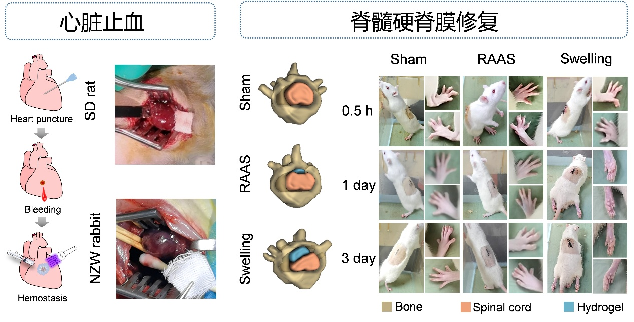 该论文研究团队顺利获得材料设计,结合“升温收缩”纳米胶束和“粘附性小分子”模块,开发了兼具快速粘附和抗吸水溶胀的“稳态”可注射粘附性水凝胶(RAAS hydrogel),能够快速粘附和封闭损伤组织,实现包括心脏出血等多种出血模型的有效止血。同时,在脊髓腔内使用时,能够封闭硬脊膜损伤,有效避免了亲水性医用胶吸水膨胀压迫损伤脊髓组织的风险,表现出在脊柱手术中的潜在应用价值(图2)。