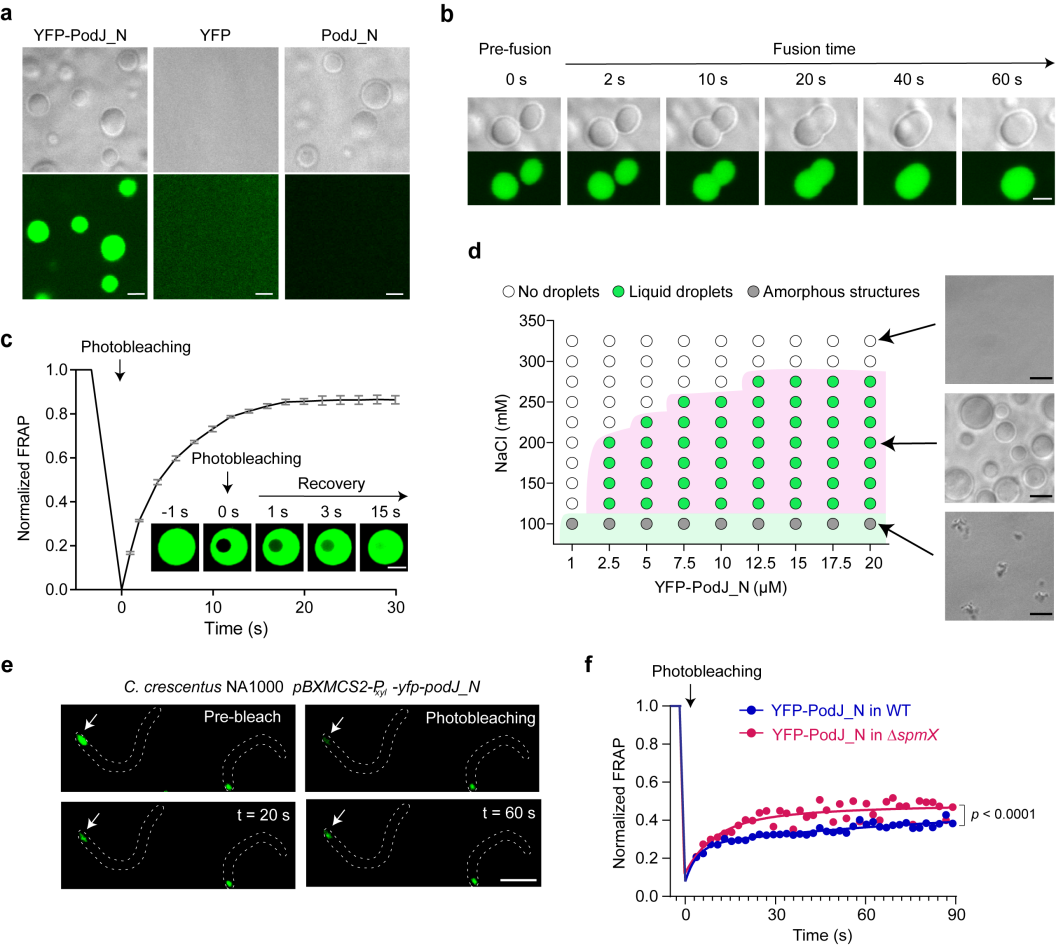 2. 脚手架蛋白PodJ相分离。a. PodJ在体外发生相分离形成蛋白液滴;b. PodJ蛋白液滴的融合特性分析;c. PodJ蛋白液滴的流动性分析;d. 盐离子浓度及蛋白浓度对PodJ相分离的影响;e-f. PodJ细胞内发生相分离及流动性分析。