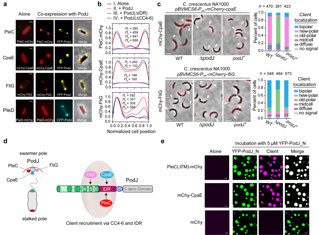 3. PodJ细胞区室化的生理功能。a-b. 在大肠杆菌中筛选与PodJ相关细胞信号蛋白;c.在新月柄杆菌中验证PodJ招募相关的细胞信号蛋白;d. PodJ招募细胞信号蛋白模式图;e. PodJ顺利获得相分离招募细胞信号蛋白。