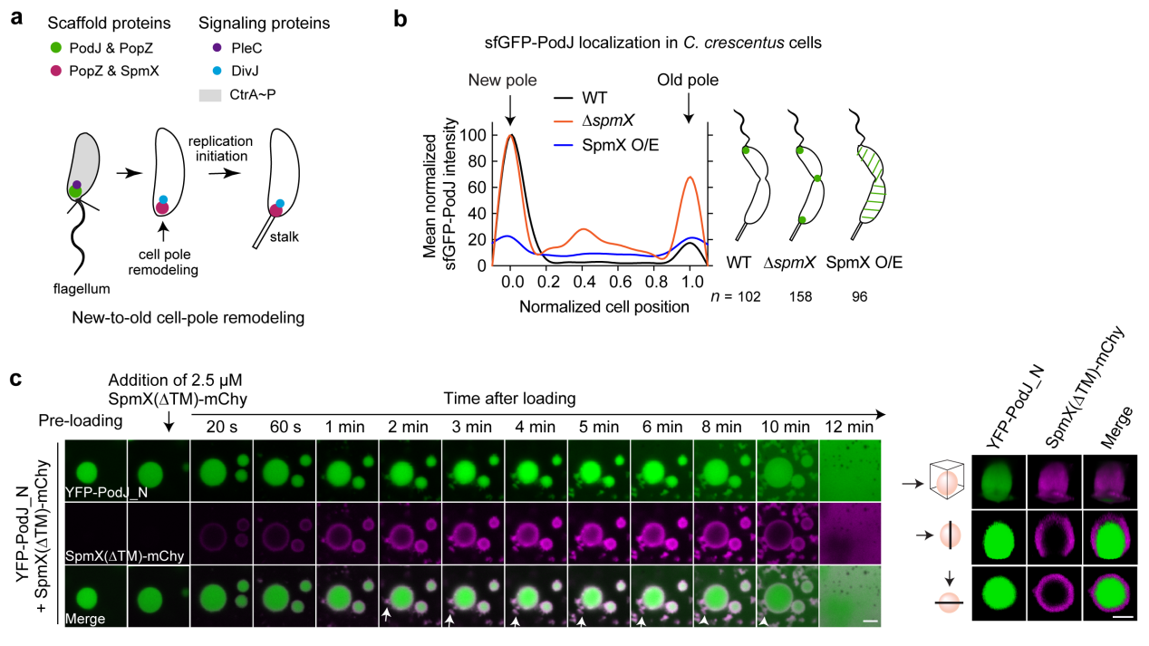 4. SpmX负调控PodJ相分离。a. 新月柄杆菌细胞新、旧极重构示意图;b. SpmX负调控PodJ细胞区室化;c. SpmX抑制PodJ相分离。