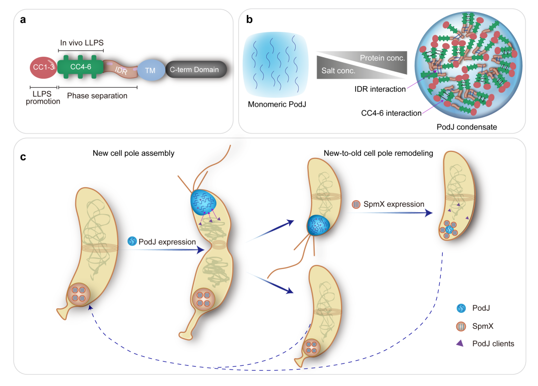 5. 脚手架蛋白调控微生物细胞极性示意图。a. PodJ结构和功能域示意图;b. PodJ相分离特征示意图;c. PodJSpmX共同调节新月柄杆菌细胞极组织和形成。