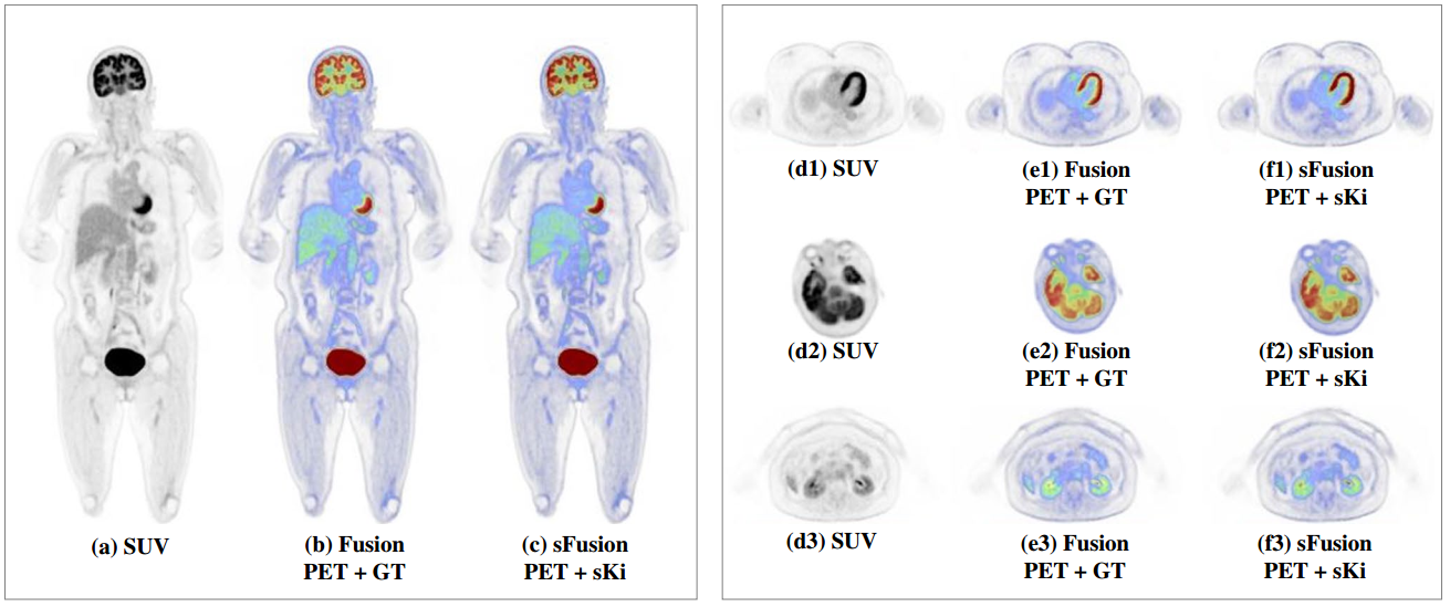进一步,为了更大的降低动态PET扫描时间并提高病人舒适度,团队与临床医院合作召开了动态PET参数图像生成的前瞻性临床研究,基于静态PET的SUV图像顺利获得网络学习来合成得到动态PET的Ki图像。采用深度学习完成动态PET参数图像的直接生成,避免了血液输入函数的计算过程。深度学习技术具有良好的特征提取和非线性拟合能力,可以用来构造不同数据分布模型之间的映射关系。实验采集了200例病人数据,定量评估指标包括峰值信噪比、结构相似性指数测量和归一化均方误差,同时也采用临床医生的主观评分作为评判并采用10折的交叉验证来评估动态PET参数图像的生成结果。实验结果揭示了深度学习技术可以有效输出高质量的合成参数图像,未来我们将进一步验证和提高网络学习模型的可解释性(图2)。相关研究工作以“Parametric image generation with the uEXPLORER total-body PET/CT system through deep learning”为题发表于核医学领域顶刊European Journal of Nuclear Medicine and Molecular Imaging(49: 2482-2492,2022),博士后黄振兴为论文第一作者。