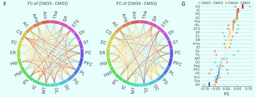 为了进一步分析POA调控体温的脑网络机制,作者还顺利获得功能核磁共振成像的方法评估了POA激活前后全脑水平的神经网络变化,发现化学遗传学刺激方法不仅激活了POA局部网络,也特异地激活了与温度、心率以及内感相关的多个核团(如岛叶皮层IC等,图4),从而绘制了体温降低过程中,全脑特异激活的神经网络。