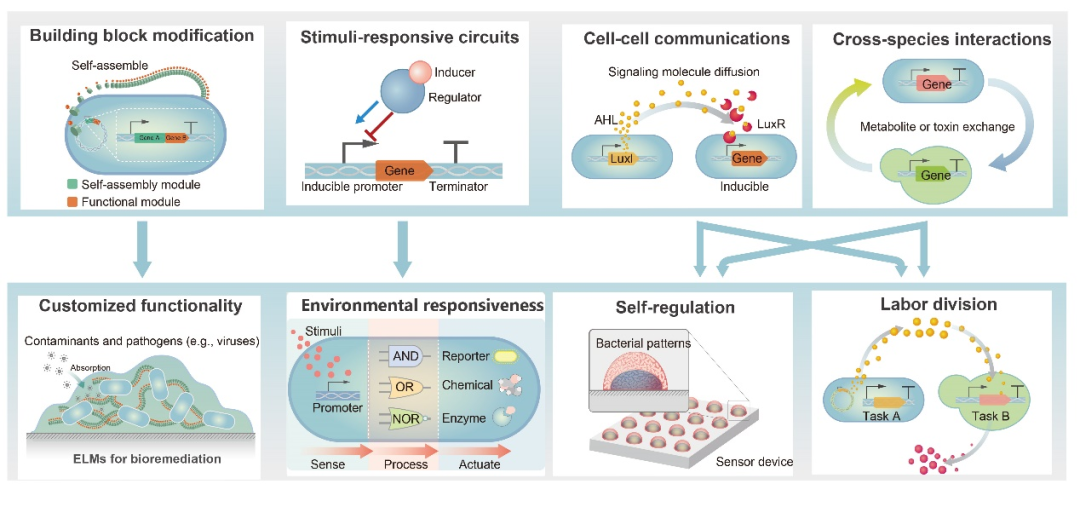 图1.工程活材料集成了生命的各种动态特征,如生物合成、自我生长、自我组织、自我修复和感知与响应环境等。工程活材料现已扩展到各种可持续应用,包括绿色能源的生物生产、污染物的生物修复、生物砖的制作以及作为医疗材料用于检测和治疗慢性疾病等。