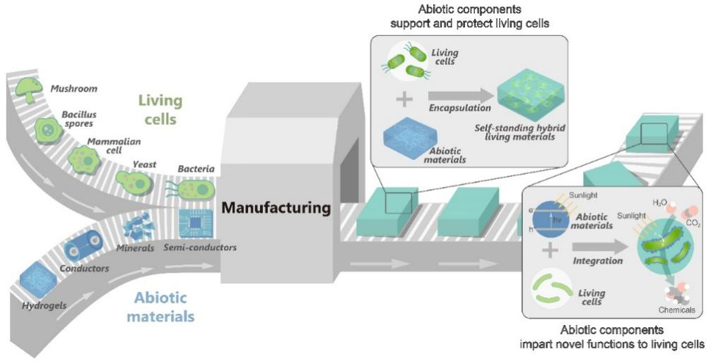 图3 工程杂合活材料的示意图。细菌、酵母、植物和哺乳动物细胞等生命系统可以与非生命成分(如聚合物水凝胶、半导体和无机矿物等)整合,使用先进的制造技术(如3D打印)生产杂合活材料。