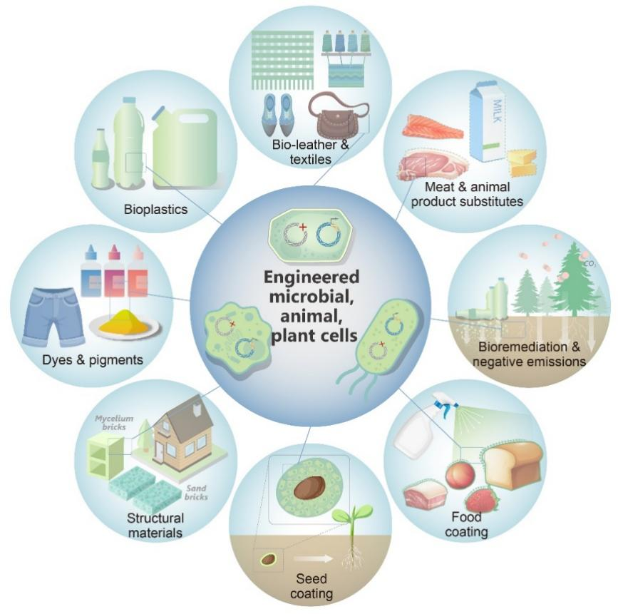 图4 活材料生产系统涉及人类日常生活的许多方面。工程化的微生物、植物和动物细胞生产的材料应用广泛,包括生物塑料、生物皮革和纺织品、动物产品替代品、生物修复和负排放、食品涂层、种子包衣、建筑材料以及染料和颜料等。