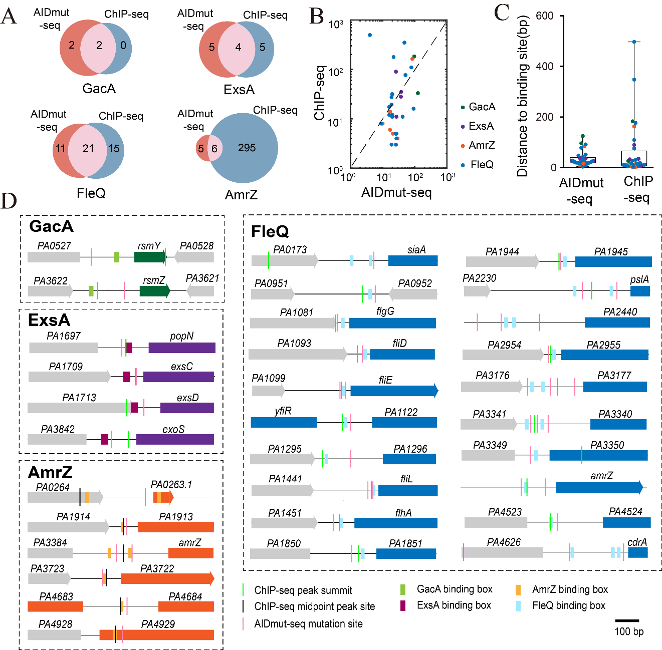 研究人员使用不同类型的转录调节因子对AIDmut-Seq进行了验证,表明该方法对大多数转录激活因子(如LasR,FleQ,ErdR,GacA,ExsA等)的具有较高效率。而对一些小的转录抑制因子(如RsaL和AmrZ等)虽然表现出较低的效率,但顺利获得该方法计算得到的转录因子识别基序(motif)和现有方法得到的基序具有很大相似性。此外,使用AIDmut-Seq还得到了许多之前没有发现的转录因子结合位点和新的调节模式。这些结果证明了AIDmut-Seq的高效性和泛用性,可以作为现有方法的重要补充工具(图2)。