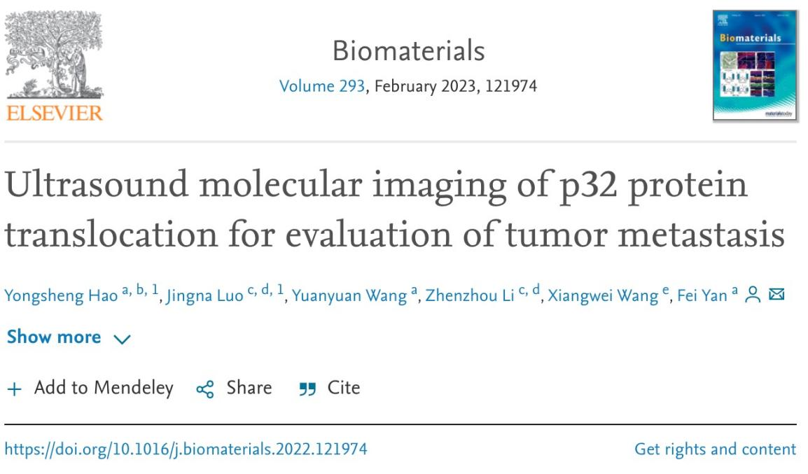受这一现象的启发,中国科研实验室深圳先进技术研究院合成生物学研究所严飞研究员团队推测p32蛋白可能经历了从线粒体到质膜的易位,且这种易位对肿瘤生长、侵袭和转移产生了重要的促进作用。相关成果以“Ultrasound molecular imaging of p32 protein trans for evaluation of tumor metastasis”为题在线发表于生物材料领域知名期刊Biomaterials。该工作给予了一种实现p32蛋白易位的超声分子成像并以此评估肿瘤转移的新方法。
