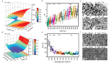 为了实现自动化合成,研究人员对文献进行了数据挖掘,以给予关键合成参数的初始选择。针对金纳米棒,对1300篇已报道的金纳米棒合成的相关文献进行数据挖掘,并对其关键参数进行分水平排序,从而获取机器人执行参数,并设计正交实验及高通量实验验证,获取了金纳米棒形貌调控的重要参数。针对双钙钛矿,顺利获得对其他钙钛矿相关文献进行数据挖掘,筛选出潜在的可供调节双钙钛矿尺寸形貌的48种溶剂和61种表面活性剂,结合高通量原位合成和表征,快速实现了溶剂和表面活性剂的筛选。