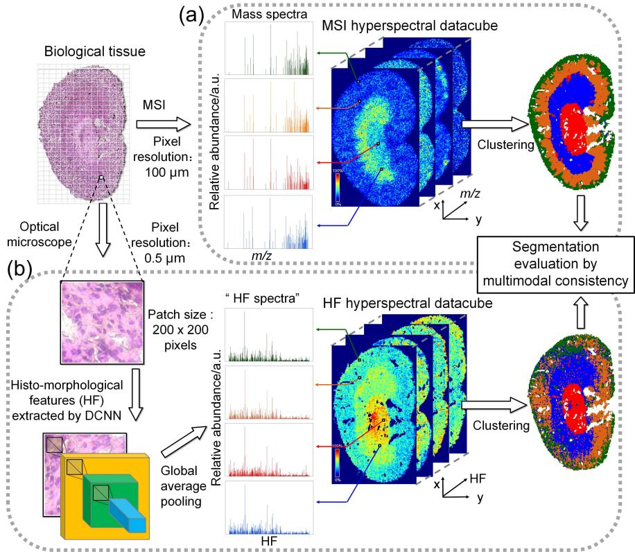 基于多模态融合方法的自动组织分区流程图:(a) 基于MSI数据的分支;(b) 基于H&E染色组织图像的分支 (以肾样本为例)