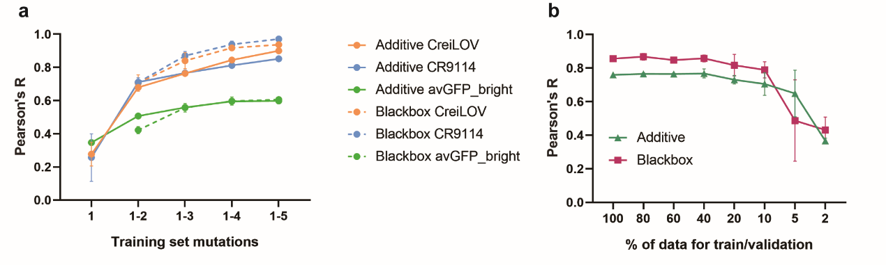 综上,文章针对单位点和多位点组合饱和突变文库召开深度突变扫描,描绘了CreiLOV氨基酸突变效应和上位效应,筛选到得到性能显著提升的CreiLOV突变体。此外,作者还展示了机器学习模型基于少量低阶突变数据预测高阶突变体表型的可行性,为机器学习辅助的蛋白质工程优化设计给予重要的参考和指导。