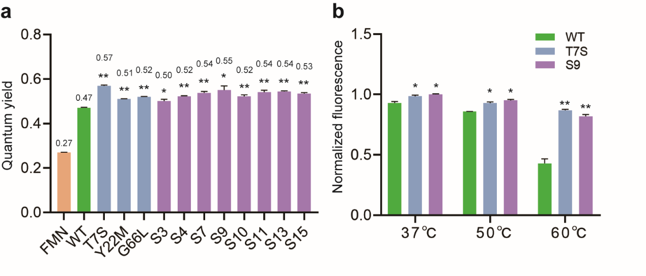 图5 CreiLOV优势突变体表征:(a)荧光量子产率;(b)热稳定性
