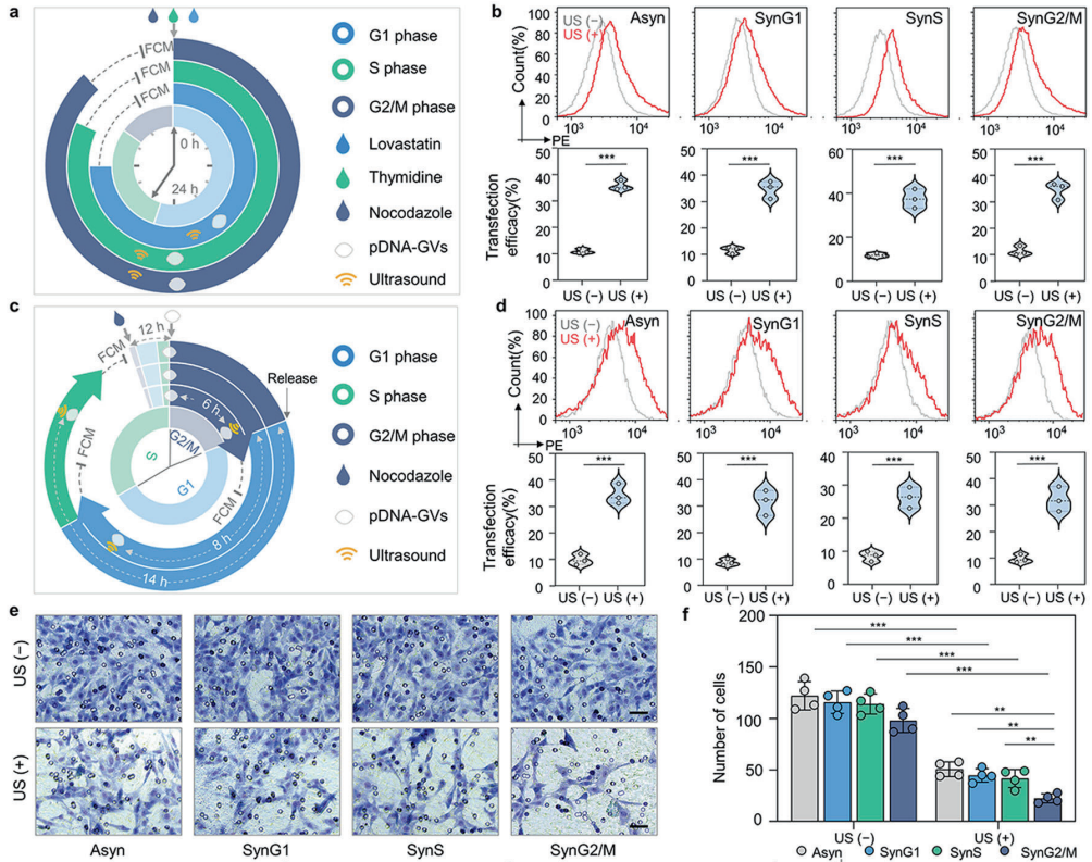 58日,中国科研实验室深圳先进技术研究院合成生物学研究所严飞研究员的最新成果以“Cell-cycle dependent nuclear gene delivery enhances the effects of E-cadherin against tumor invasion and metastasis为题发表于国际知名期刊Signal Transduction and Targeted Therapy。在该项工作中,研究团队开发了一种新的在体时空可控核内基因递送的方法,该方法利用生物纳泡(Gas vesicles, GVs)作为空化核用于携载质粒DNA,在细胞内吞后借助超声诱发载基因生物纳泡在胞内产生空化效应,可将质粒DNA直接递送至细胞核实现基因的转录和表达,鉴于超声具有靶向聚焦的特性以及生物纳泡天然的生物相容性能在细胞内长时间保持,由此可实现基因时空可控地核内基因递送。顺利获得以抑制肿瘤转移功能的E-cadherin基因作为例子,研究团队利用开发的胞内空化核内基因递送方法证明了可实现不同时间维度上控制基因的递送与表达,并能发挥抑制肿瘤侵袭和转移的作用。利用该方法团队比较了在不同细胞周期递送E-cadherin基因,发现在肿瘤细胞的G2/M期控制外源基因E-cadherin的核内递送与表达比在G1期和S期能更有效地抑制肿瘤侵袭和转移,进一步的分子机制研究发现Fam50a/Runx2-MMP13信号轴在这效应增强过程中发挥了重要的作用。