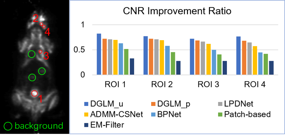 4:不同方法对不同 ROI 所产生的 CNR 改善率直方图,ROI标注于左侧图像(活体小鼠数据)