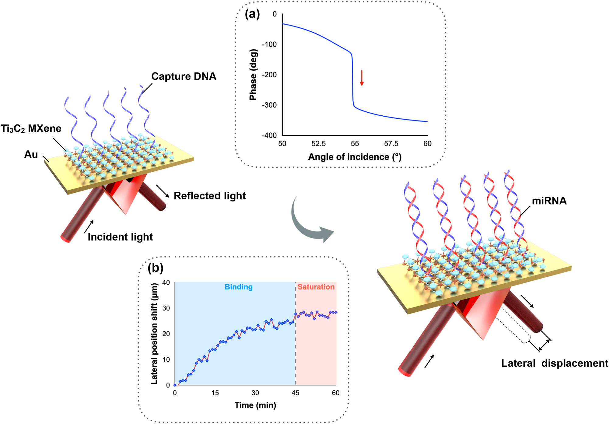 为解决上述难题,该团队提出了一种基于横向位移检测机制的MXene增强SPR生物传感技术,用于超灵敏无标记的miRNA-21检测。该传感方案利用了MXene纳米材料表面积大和载流子约束能力强等特性,并对等离子体传感衬底的吸收系数进行调控,使其达到“零反射”状态,在SPR共振角处引起极急剧的相位变化,从而诱发较大的横向位移传感信号变化,能够对SPR传感基底表面的生物分子和生物反应进行实时监测。