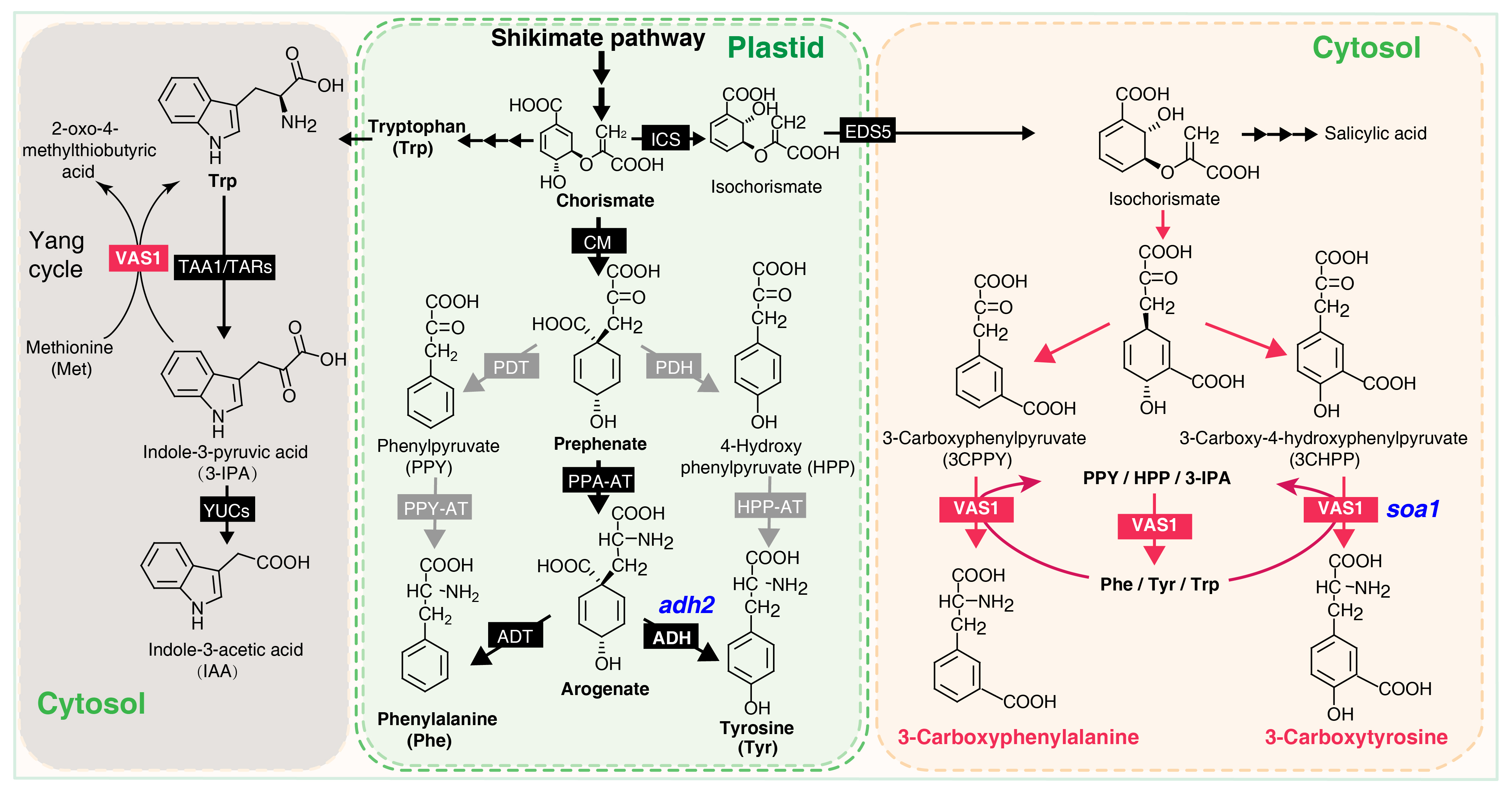 顺利获得对vas1基因缺失突变体的非靶代谢组分析,鉴定了VAS1的产物为3-羧基苯丙氨酸和3-羧基酪氨酸。研究发现,VAS1可以利用苯丙氨酸,色氨酸和酪氨酸这三种芳香族氨基酸作为氨基供体,来合成一类新的代谢物—3-羧基苯丙氨酸/酪氨酸(图2)。芳香族氨基酸合成通路在叶绿体,而VAS1催化的3-羧基芳香族氨基酸的合成反应发生在细胞质中。团队顺利获得同位素标记实验证实,3-羧基芳香族氨基酸并不来源于芳香族氨基酸苯环上的直接修饰。遗传学证据表明,VAS1的前体合成来自于细胞质中的异分支酸途径(图2)。VAS1除了可以消耗氨基酸以外,还可以利用苯丙酮酸、4-羟基苯丙酮酸和3-吲哚丙酮酸为底物,在细胞质中生成苯丙氨酸、酪氨酸和色氨酸(图2);而3-羧基苯丙氨酸可以抑制该反应,从而达到对氨基酸含量精确调控。