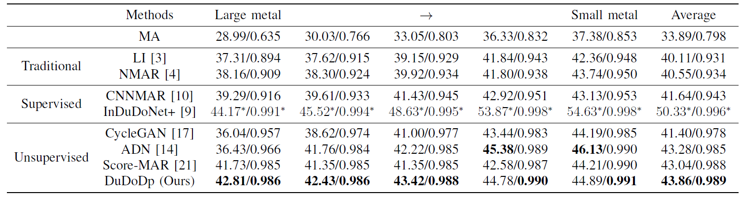 3. 不同金属伪影去除方法的PSNR/SSIM比较,其中粗体表示在无监督方法中的最佳结果,星号(*)表示包括监督方法在内的最佳结果。