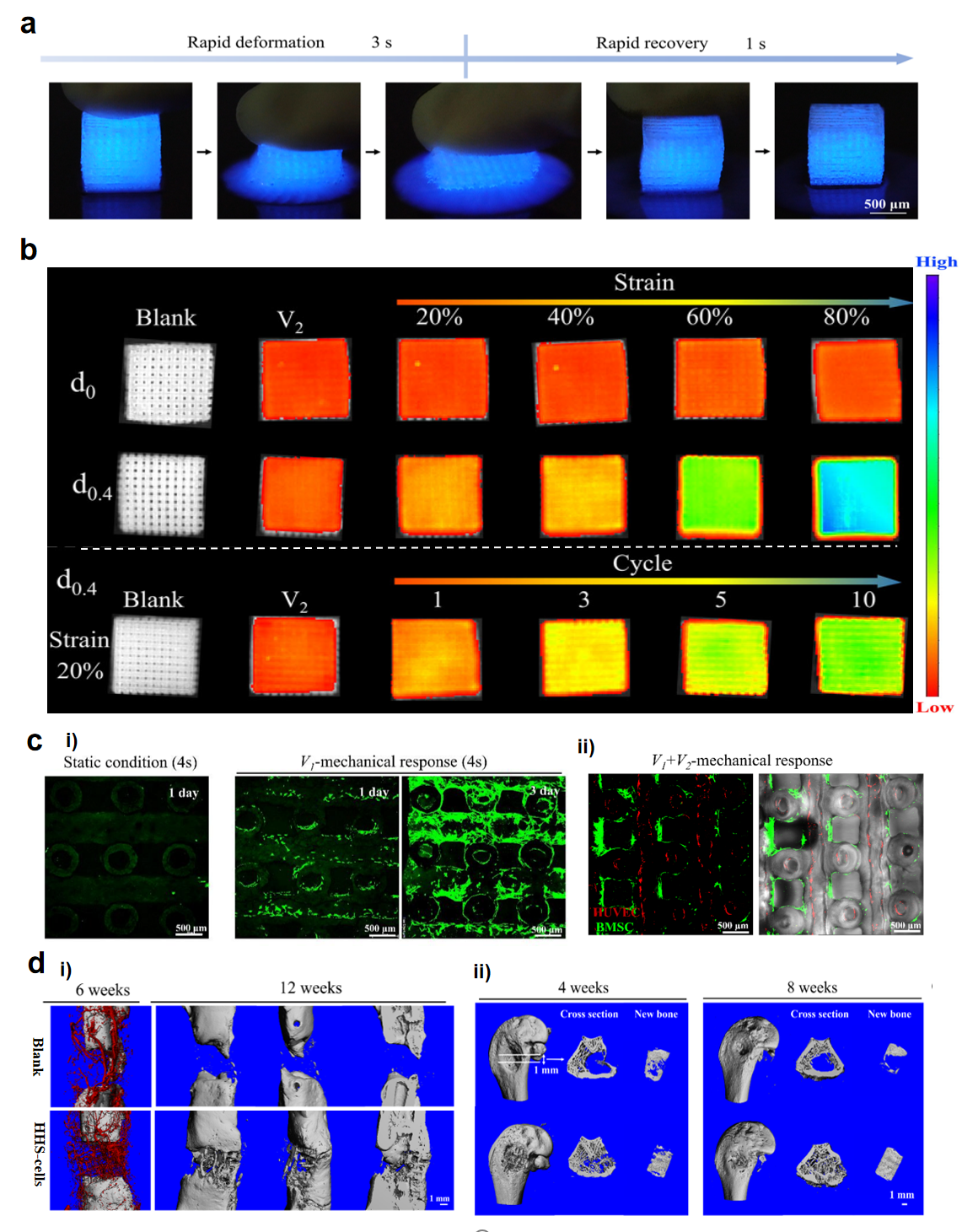 图2. (a) HHS的压缩回弹性;(b)HHS力学响应性;(c)力学响应负载细胞;(d)HHS-细胞重建大鼠节段骨和骨质疏松骨缺损