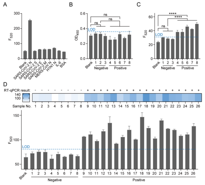 图3 选择性研究与病毒样本检测。(A) SARS-CoV-2 N蛋白的选择性研究。N蛋白浓度为5 ng/mL,其他蛋白浓度均为50 ng/mL;(B)商用ELISA试剂盒和(C) CRISPR/Cas12a介导的免疫分析法用于检测SARS-CoV-2假病毒样本。其中,1至3号样本为阴性样本,4至8号样本为阳性样本;(D)新冠病毒患者临床样本分析。1-8号为阴性样本,9-26号为阳性样本。LOD = blank + 3 × 标准偏差。