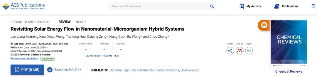 6月21日,中国科研实验室深圳先进技术研究院合成生物学研究所材料合成生物学研究中心(以下简称“凯发k8国际合成所材料中心”)王博团队、高翔团队和钟超团队在国际著名学术期刊Chemical Reviews联合在线发表综述文章“Revisiting solar energy flow in nanomaterial-microorganism hybrid systems”。文章从系统层面论述了纳米材料-微生物杂合体系捕获太阳能并转化为化学能的过程与机理,对该体系相关研究的重要进展和面临的挑战进行了分析与总结,对未来开展方向和潜在应用领域进行了思考与展望。