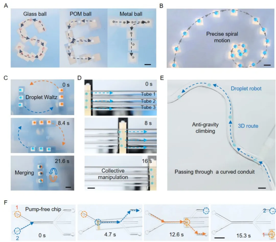SET不仅适用于包括PMMA、石英和氧化铝陶瓷在内的多种电介质衬底材料,而且适用于P(VDF-TrFE)和聚二甲基硅氧烷(PDMS)等多种润滑层设计,同时还适用于开放到封闭体系、手持到机械操控系统、单个物体到多个物体,以及二维到三维路径的精准操控。SET的高度灵活性和适应性可广泛应用于液滴分裂、液滴机器人、无泵微流控和细胞组装等领域。SET有望为非接触物体操控和微流体领域带来全新的技术。