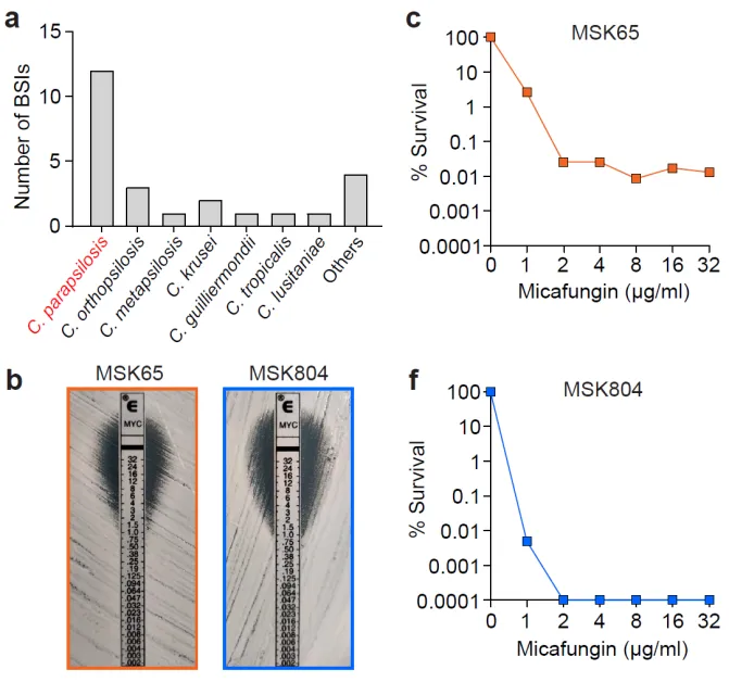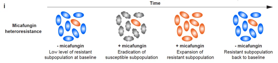 作者第一时间回溯分析了2016–2020年间在纪念斯隆凯特琳癌症中心(MSKCC)接受造血干细胞移植的952名患者中发生的突破性真菌血流感染病例,发现其中近半数由近平滑念珠菌(Candida parapsilosis)造成。这些病人移植期间均使用米卡芬净(一种棘白菌素类药物,靶向真菌细胞壁合成)预防真菌感染。值得注意的是,引起突破性感染的近平滑念珠菌都被鉴定为米卡芬净敏感菌。因此,研究者对这些菌株进行了更精确的菌落谱型分析(Population Analysis Profiling,PAP),发现其中多数对米卡芬净发生了异质性耐药。