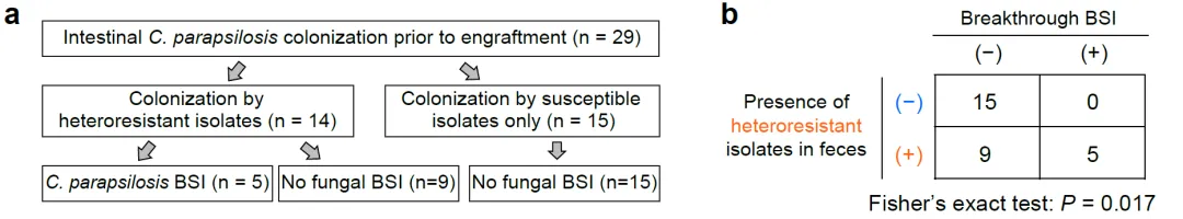 在前期的系列工作中,翟冰课题组基于同一临床队列发现近平滑念珠菌在肠道中定植是发生真菌血流感染的必要条件 (Nature Medicine 2020),但移植期间出现肠道近平滑念珠菌定植的患者仅有部分会发生真菌感染 (Nature Microbiology 2021)。在本研究中作者顺利获得综合分析200多例移植病人的临床信息、肠道菌群信息和肠道/血液近平滑念珠菌菌株的药敏表型,发现在29名移植期间出现近平滑念珠菌肠道定植的患者中,定植有异质性耐药菌株的患者发生突破性血流感染的风险显著高于仅有敏感菌株肠道定植的患者。