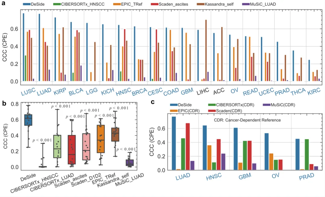 ▲图2. 对比DeSide与其它算法预测bulk RNA-seq数据中肿瘤细胞比例的能力。CCC为预测的肿瘤细胞比例与基于基因拷贝数所估算的肿瘤纯度之间的一致相关性系数(concordance correlation coefficient,CCC)。数据来源于癌症基因组图谱(The Cancer Genome Atlas,TCGA)数据库。