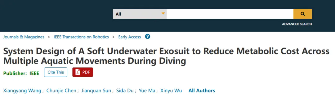 研究成果以System Design of A Soft Underwater Exosuit to Reduce Metabolic Cost Across Multiple Aquatic Movements During Diving 为题,发表在机器人领域权威期刊 IEEE Transactions on Robotics。智能仿生中心博士后王向阳和陈春杰研究员为共同第一作者,吴新宇研究员为通讯作者。其它作者中,马跃和孙健铨协助外骨骼系统搭建,杜思达协助实验实施。IEEE Transactions on Robotics 是IEEE旗下机器人与自动化协会的汇刊,是国际机器人领域顶级期刊之一。