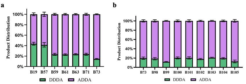 图 2. 解析DDDA合成的机制。(a)依次敲除7个醛脱氢酶,以及(b) 单独敲除9个醛氧化酶或还原酶对DDDA积累的影响。