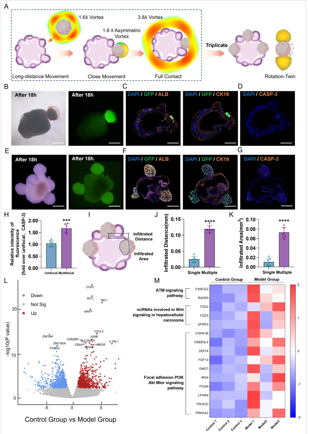 在这项研究中,研究人员以主要聚焦于肝癌转移模型,并开发了一种组织工程技术—全息声镊(Holographic Acoustic Tweezers, HAT),顺利获得个性化构建多重复合声场,实现了对肝癌细胞球的非接触式、精准操控。研究还利用人多功能干细胞(hiPSCs)诱导分化出可以同时表达肝脏和胆管结构功能的肝胆类器官(Hepatobiliary Organoids, HBOs),并利用表达绿色荧光蛋白(GFP)的人肝癌细胞系HuH-7构建肝癌细胞球。同时,顺利获得免疫荧光染色和RNA测序分析,系统评估了不同参数下三维声场对肝胆类器官和细胞球安全性的影响,并进一步优化了操控参数。基于全息声镊和三维细胞培养技术,研究人员进一步开发了“类器官-细胞球在线组装平台”(Organoid-Spheroid Online Assembly Platform, OSOAP),用于构建体外单灶性及多灶性肝癌转移模型,并顺利获得免疫荧光与Bulk RNA测序验证模型的可靠性。实验结果表明,该肝癌转移模型可以可视化肝癌浸润周围肝胆系统的过程,并且可以上调表达肝癌转移过程中特异性的信号通路。