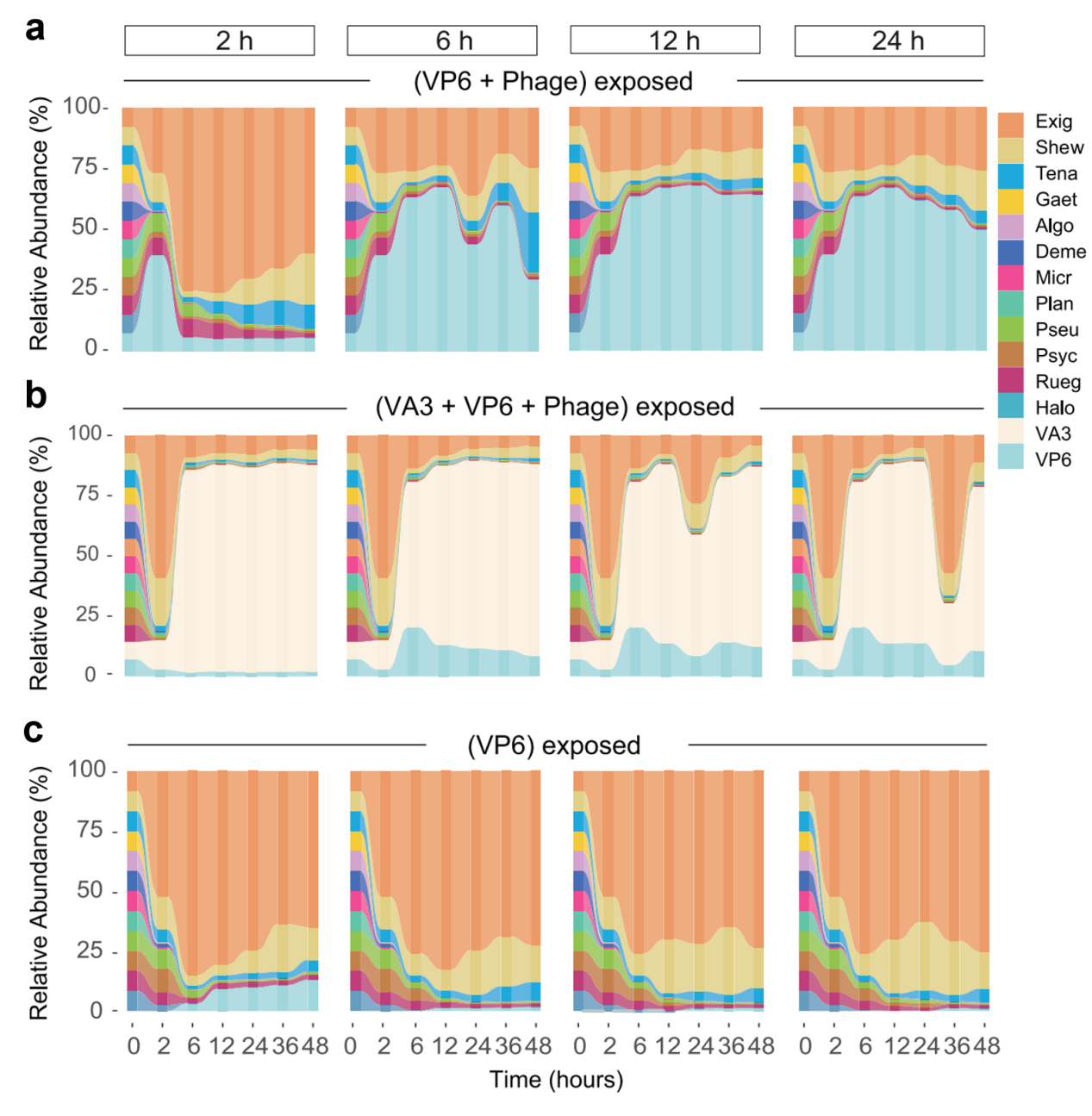 为验证抑菌效果是否受共生菌和噬菌体加入时机的影响,研究团队设计了时间梯度实验。当单独使用噬菌体VP6phageC时,其抑制效果随添加时间推迟而减弱,延迟6小时后添加几乎无法逆转VP6的定植优势(图4a)。而当VA3与噬菌体联用时,VA3能在噬菌体完成“杀菌”过程后快速“占位”(占据生态位),形成陆续在防御体系(图4b)。值得注意的是,即使在联合处理条件下,延迟6小时处理的防控效果仍显著低于2小时内的早期处理组。