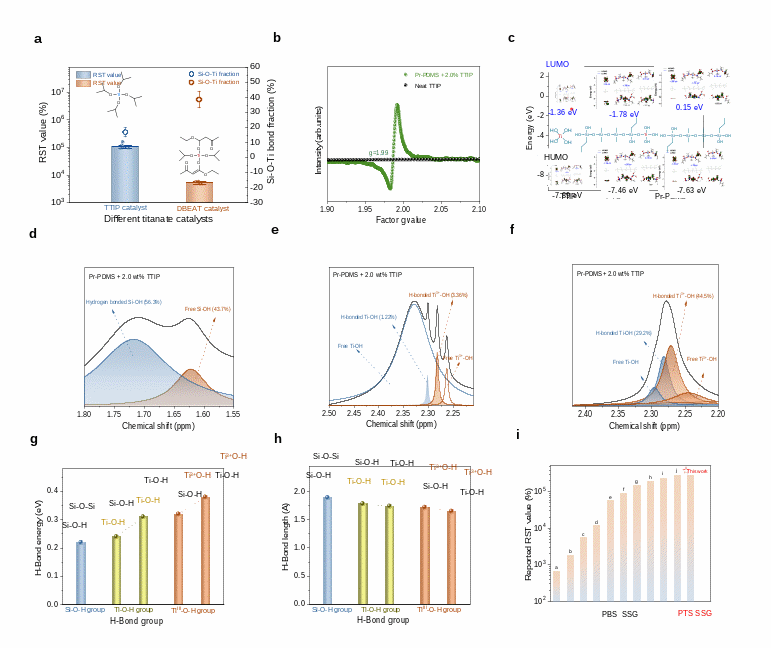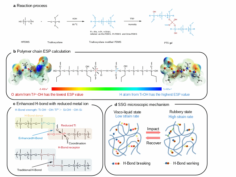 针对上述问题,何睿团队开发出新型聚钛硅氧烷体系(PTS),首次提出基于金属离子介导的氢键增强策略调控超分子网络中的氢键强度,来替代传统PBS体系中的B-O动态键。与PTS中的Si-OH相比,体系中Ti3⁺-OH的O原子电荷密度更高,而Ti4⁺-OH的H原子电荷密度更低,因此作为氢键供体和受体能产生更强的氢键相互作用(图1)。当承受高频剪切应力时,氢键形成的动态可逆网络难以断裂,无序的高分子链无法松弛和解缠,高分子链运动受限在宏观尺度上呈现出高刚性状态。本工作开发的新型PTS SSG克服了传统PBS体系的腐蚀性和毒性问题,同时提出的金属离子介导的氢键增强策略为其他超分子功能材料构建给予了新路径。
