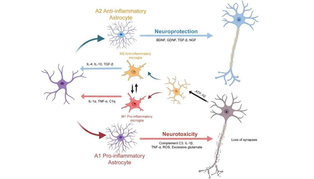 综述系统梳理了小胶质细胞与星形胶质细胞之间的多重反馈环路。活化的小胶质细胞可释放 IL-1α、TNF-α、C1q、ROS 等因子,诱导星形胶质细胞进入更具神经毒性的反应状态;而反应性星形胶质细胞又可顺利获得C3/C3aR轴、代谢产物释放、谷氨酸失衡以及细胞外囊泡等方式,反过来维持或强化小胶质细胞的促炎激活。