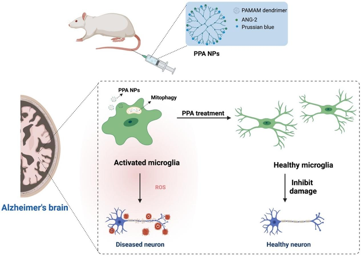 在该工作中,研究团队开发了一种拥有优异的血脑屏障(BBB)通透性的纳米颗粒,由普鲁士蓝/聚酰胺-胺型(PAMAM)树状大分子/血管生成素-2 (PPA)组成,顺利获得调节线粒体自噬,清除活性氧因子(ROS)恢复小胶质细胞的生理功能,从而治疗阿尔茨海默症。文章的第一作者为于寅课题组研究助理钟刚,共同一作为石胜良团队龙惠萍;于寅副研究员和陈飞副研究员、广西医科大学第二附属医院石胜良教授为共同通讯作者。
