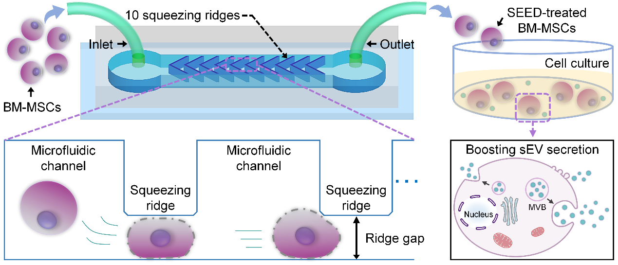 然而在常规培养条件下,供体细胞往往存在分泌效率有限、外囊泡产量低等技术问题,极大的限制了细胞外囊泡的实际应用。为了提高细胞外囊泡的分泌量,常用的技术手段包括分子调控、乙醇处理、pH调节等生化策略,因依赖于生化试剂添加物,易改变细胞生理状态而影响外囊泡的功能性和安全性。为应对这一挑战,杨慧团队提出一种名为“种子SEED芯片 (Small Extracellular vEsicles Developer)”的微流控编辑平台,能够高通量且无损伤的刺激细胞,提高细胞外囊泡的分泌量。