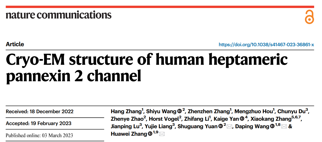 1. Zhang, H., Wang, S., Zhang, Z. et al. Cryo-EM structure of human heptameric pannexin 2 channel. Nat Commun 14, 1118 (2023).