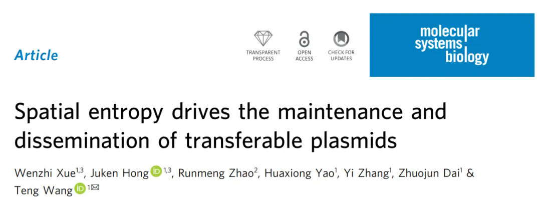 5月1日,王腾研究员课题组在Molecular Systems Biology上发表了题为"Spatial entropy drives the maintenance and dissemination of transferable plasmids"的研究论文。该工作首次将物理学中“熵”的概念引入微生物生态学,揭示了空间结构驱动基因水平转移的普适机制。