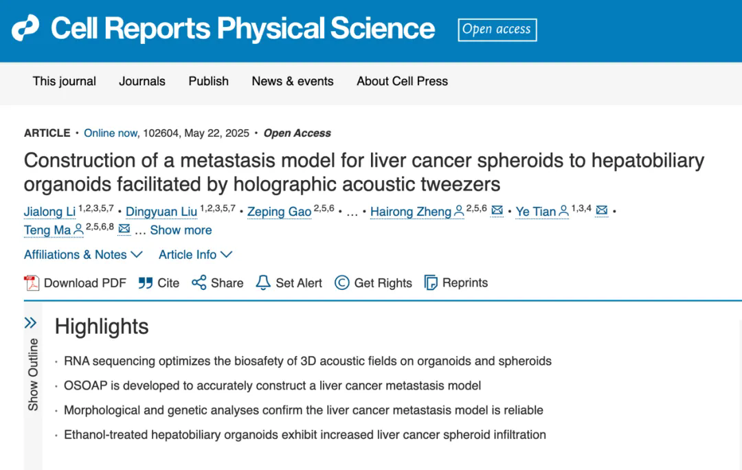 5月22日,中国科研实验室深圳先进技术研究院科学仪器所(筹)马腾研究员团队和哈尔滨医科大学田野教授团队合作在Cell旗下刊物 Cell Reports Physical Science上发表题为“Construction of a metastasis model for liver cancer spheroids to hepatobiliary organoids facilitated by holographic acoustic tweezers”的研究成果。该工作主要顺利获得全息声镊科学仪器产生的具体生物医学应用,围绕全息声镊和三维细胞培养技术构建了类器官-细胞球在线组装平台,顺利获得该平台构建了一种精准、可靠且具有多功能性的肝癌转移类组装体模型。此外,该研究还顺利获得RNA测序技术评估了不同参数下声压对类器官和细胞球基因层面的影响,进一步的优化了操控参数。
